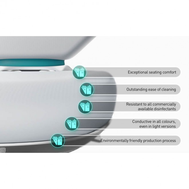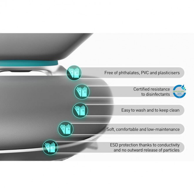 En ince ayrıntısına kadar hijyenik tasarım – CLEANROOM TEXON'un temizliğini daha da detaylı ve daha da basit hale getirmek için sandalyenin değiştirilebilir döşemesi bulunmaktadır. Sırt ve oturak döşemeleri çıkarıldığında, hem döşemeler hem de plastik parçalar derinlemesine temizlenebilir. Döşemenin altındaki yüzeyler yalıtılmış ve neredeyse eklemsizdir, bu da onların kolayca silinmesini sağlar.
