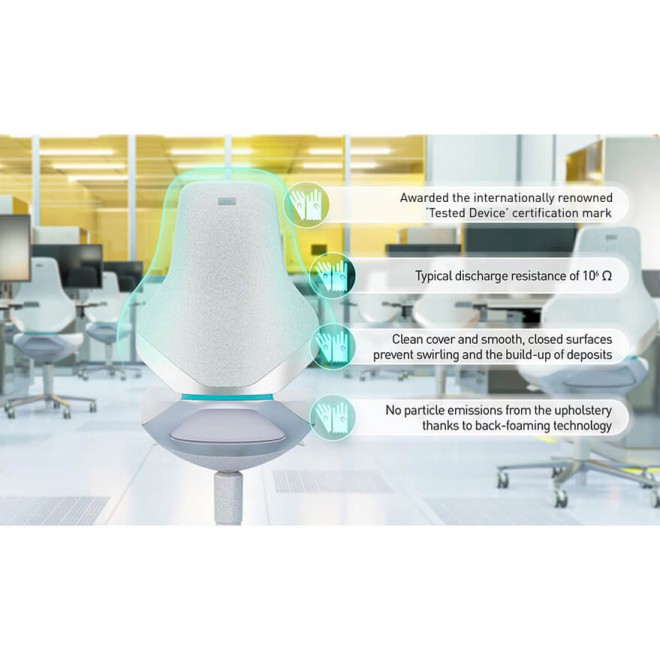 Hijyenik tasarımı sayesinde CLEANROOM TEXON, yüksek teknoloji ve biyoteknoloji ortamlarının zorlu gereksinimlerinin hepsini karşılamaktadır. Eklemsiz tasarımı, kirin çatlaklarda veya oyuklarda birikmesini önler ve parçacıkların salınımını engeller. Pürüzsüz, kapalı yüzeyler sayesinde sandalyenin temizlenmesi için basit bir silme işlemi yeterlidir. Özel bir detay ise, mekanizmayı koruyan ve temizliği daha da kolaylaştıran Clean Cover'dır.