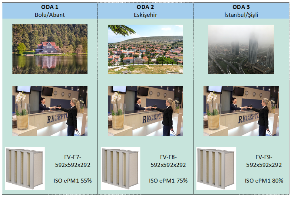 ODA 3 dış ortam hava kalitesinin olduğu İstanbul/Şişli’de yer alan benzer bir otelin ise aynı iç hava kalitesine ulaşması için kullanması gereken filtre verimliliği ePM1 %80 olup (FV-F9-592x592x292) karşılık geldiği filtre sınıfı F9’dur. Her iki uygulamada da taze hava girişinde ön filtre kullanımı tavsiye edilmektedir.