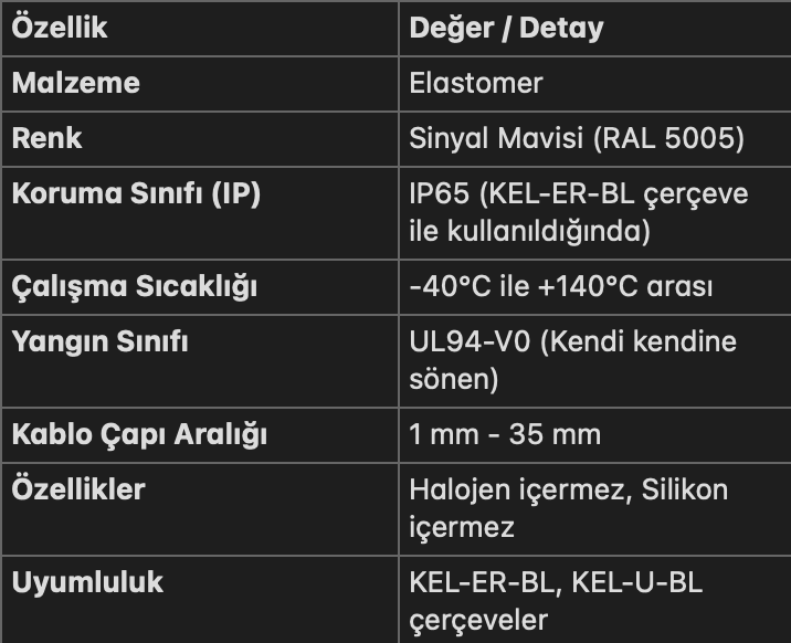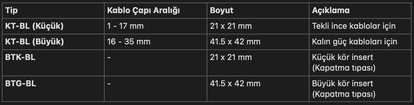 Bu insertler, icotek KEL-ER-BL kablo giriş çerçeveleri ile birlikte kullanılarak, önceden konnektör takılmış kabloların kesilmeden panolara montajını sağlar. Ayrılabilir (yarık) yapısı sayesinde montaj ve bakım işlemleri son derece hızlıdır. 1 mm'den 35 mm'ye kadar geniş bir kablo çapı yelpazesini kapsar.