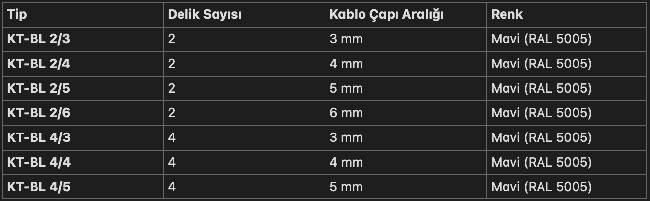 KT-BL multi Mavi Çoklu Kablo İnsertleri (Görsel Tespit ve Yüksek Yoğunluk / RAL 5005)