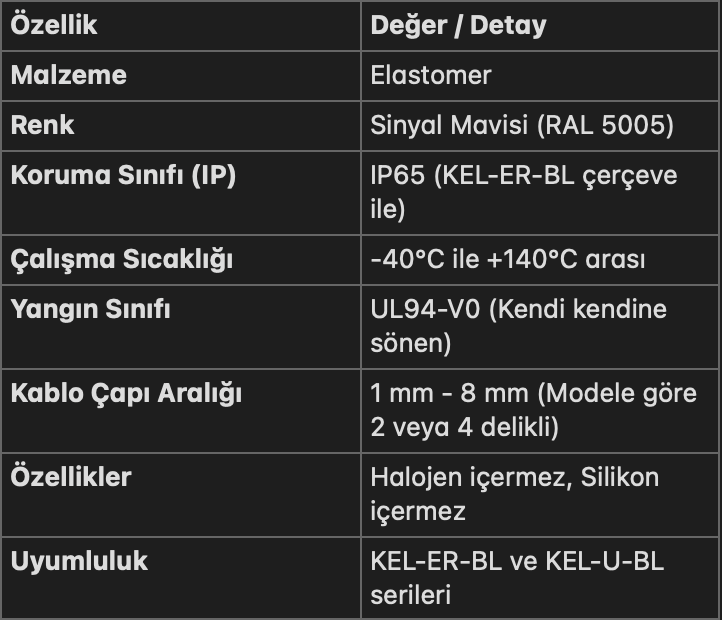 Sinyal mavisi (RAL 5005) rengi sayesinde, gıda üretim hatlarında olası bir parça düşmesi durumunda "yabancı madde" olarak anında görsel tespit imkanı sunar. icotek KEL-ER-BL çerçevelerle tam uyumlu olan bu insertler, konnektörlü kabloların kesilmeden montajına olanak tanıyan ayrılabilir (yarık) yapıdadır. IP65 koruma sınıfı ile su sıçramalarına karşı güvenli bir sızdırmazlık sağlar.