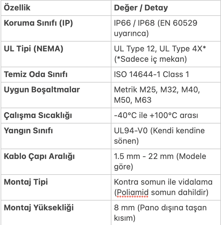 Yuvarlak yapısı sayesinde panolarda önceden açılmış standart deliklere kolayca monte edilebilir. Kablolar, sadece ince zarı delip iterek geçirilir; bu işlem sırasında kablo etrafında çift taraflı sızdırmazlık oluşur ve IP66 / IP68 koruma sınıfı sağlanır. ISO 14644-1 sertifikası ile partikül emisyonu ve gaz salınımı (VOC) açısından en hassas ortamlar için uygundur.