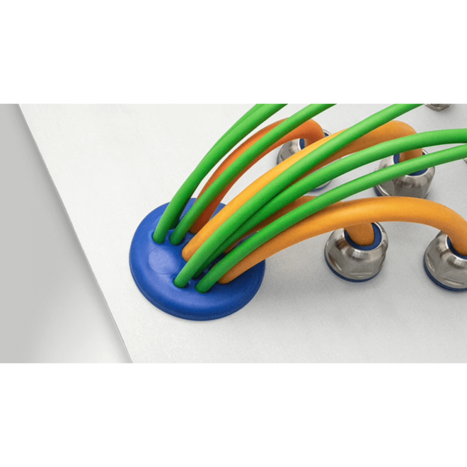 M32'den M63'e kadar metrik diş seçeneklerine sahip olan bu plakalar, EHEDG (Avrupa Hijyenik Mühendislik ve Tasarım Grubu) yönergelerine uygun olarak tasarlanmıştır. Ön yüzeyinde kir tutabilecek hiçbir girinti veya çıkıntı bulunmaz; yüzey pürüzlülüğü (Ra) 0,421 μm seviyesindedir. FDA uyumlu mavi elastomer malzemesi, gıda güvenliği için görsel tespit kolaylığı sağlar. Aynı zamanda ISO 14644-1 sertifikası ile temiz odalarda güvenle kullanılır.