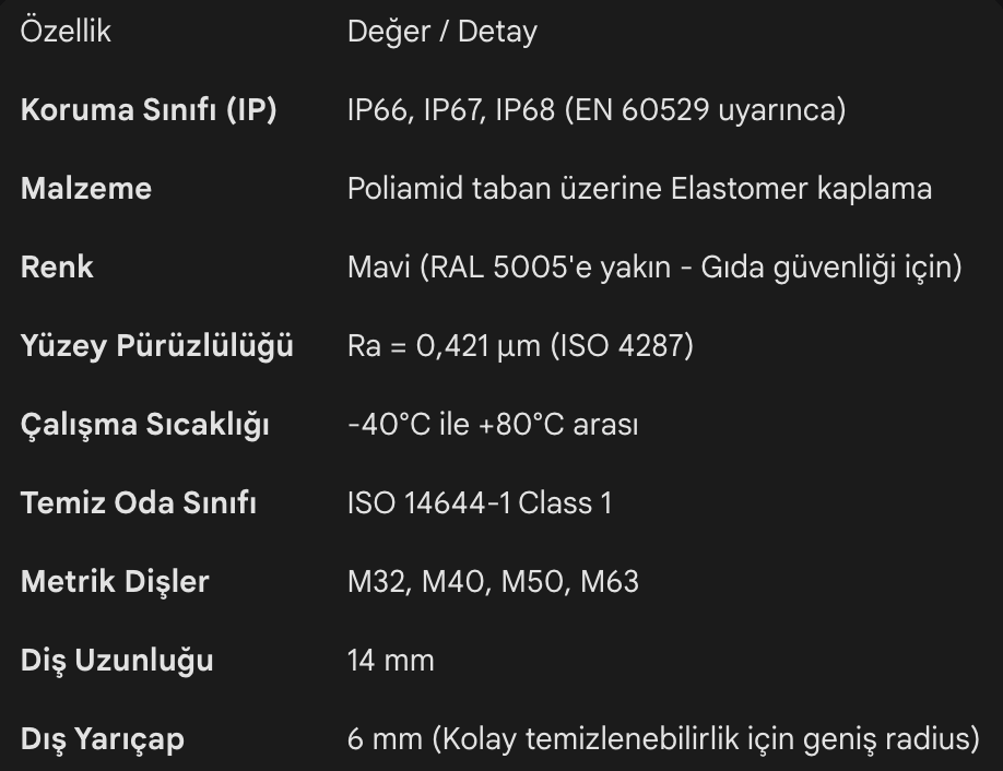 KEL-DPZ-HD CR serisi, hem partikül kontrolünün (Cleanroom) hem de mikrobiyolojik güvenliğin (Hygienic Design) kritik olduğu en zorlu ortamlar için geliştirilmiştir. Özellikle gıda, ilaç ve ambalaj makineleri için tasarlanan bu ürün, soketsiz (konnektörsüz) kabloların geçişinde standart rakorlara göre çok daha üstün bir hijyen standardı sunar.