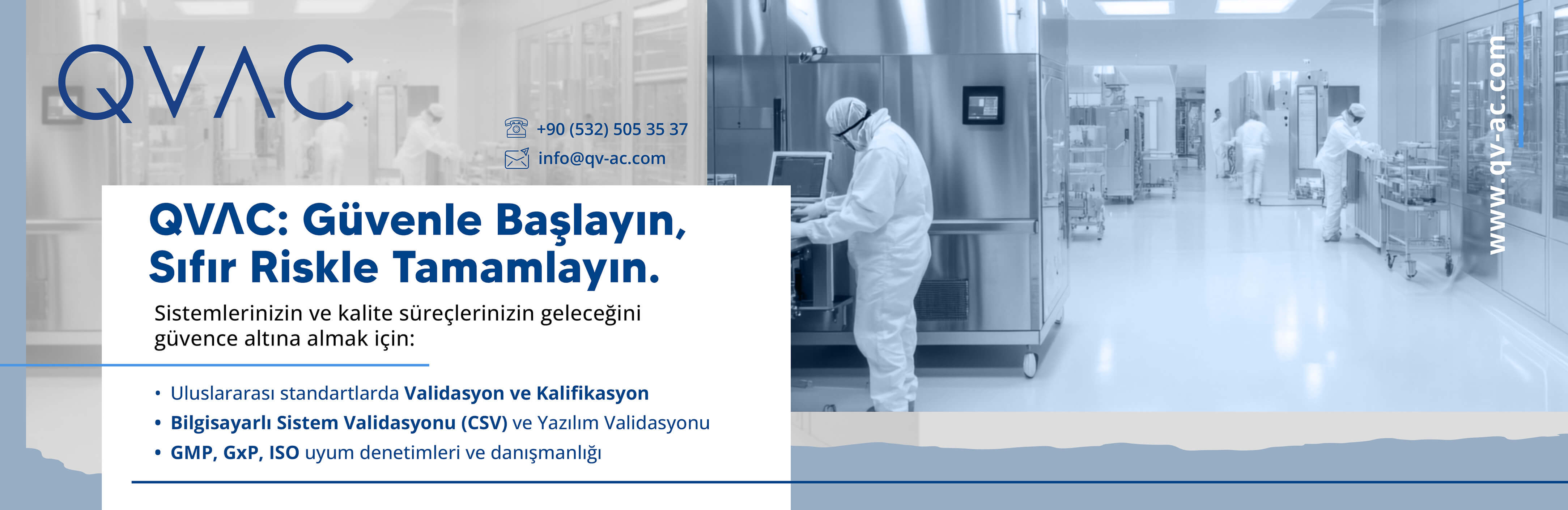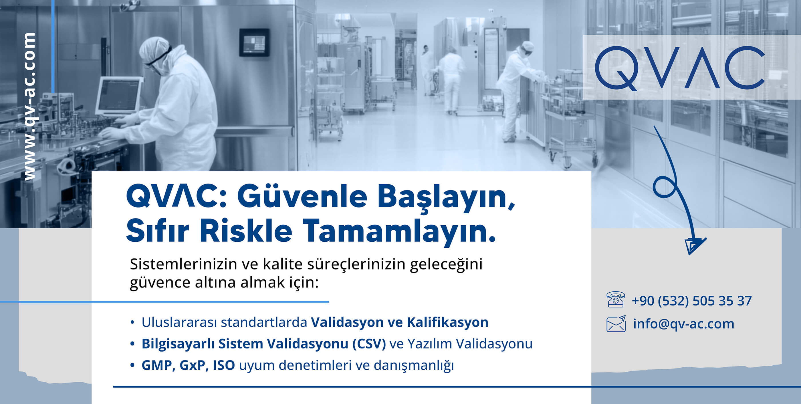 QVAC Validasyon Danışmanlık Ltd.Şti. 2017 yılında İstanbul ‘da kuruldu.20 yıla yakın ilaç sektöründe elde edilen bilgi ve tecrübe ile başta ilaç, biyoteknoloji, medikal cihaz olmak üzere yine bu sektörlere hizmet eden makina, yazılım, proses ve ürün-süreç güvenliği gibi konularda hizmet veren firmalara cGMP, ISO13485, OECD GLP, PIC/S GAMP5 regulasyonları kapsamında uygulamalı hizmetler sunar ve danışmanlık yapar.Üretim, Laboratuvar ve Altyapı sistemleri Kalifikasyonu, Validasyonu, Data Integrity, Bilgisayarlı Sistem Validasyonu gibi konularda hizmet verir. GMP, ISO13485 Kalite Yönetim Sistemleri danışmanlığı ve GLP Akreditasyonu kapsamında danışmanlık yapar.Yetkin personelleri ile kalite sistemleri, dijital süreç yönetimleri, yapay zeka validasyonu, Track&Trace, Serialization projelerinde ilkleri başarmış ve dijital dönüşümle birlikte müşterilerine gelişen çağa ayak uydurma yolunda destek olur.100 ‘ü aşkın yerli yabancı firma ile yurtiçi ve yurtdışında bir çok farklı projeye imza atan QVAC Validasyon Danışmanlık, özellikle uluslararası regulasyon ve standartların gerekliliklerin sağlanması yönünde çözümler bularak fark yaratmaktadır.